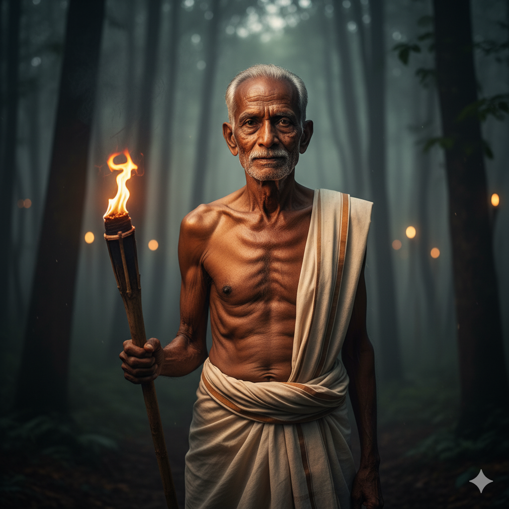 An old man around seventy years old came closer carrying a bundle of firewood on his head and holding a burning torch in his hand.